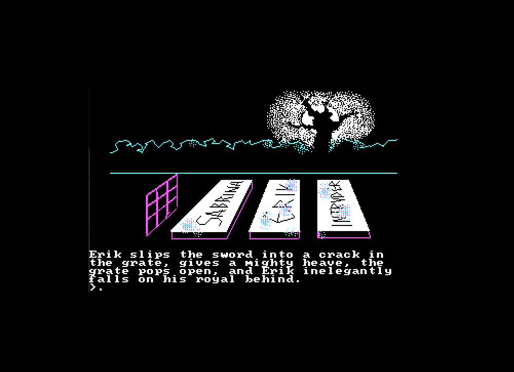 It’s also possible to ask your companions for their opinions on most locations and situations you find yourself in. Sabrina’s and Erik’s participation is in fact crucial to the success of your quest so you need to know how to talk to them. With the Apple II version, finding that out proved to be very difficult. Because just typing SABRINA, CAST SPELL like you would any other command doesn’t work. (Yes, the Apple II version needs caps lock, DOS does not.) Eventually I stumbled upon a forum thread explaining that you need to use quotation marks for companion commands. So “SABRINA, CAST SPELL” works just fine. (But the emulator will assume you are using an American keyboard, so keep that in mind.) The DOS version is not picky at all, so you should have no problems communicating there. Some of the most enjoyable actions that can be triggered by companion commands is Erik using his sword in the clumsiest ways imaginable. (It’s wise to stay waaay back.)