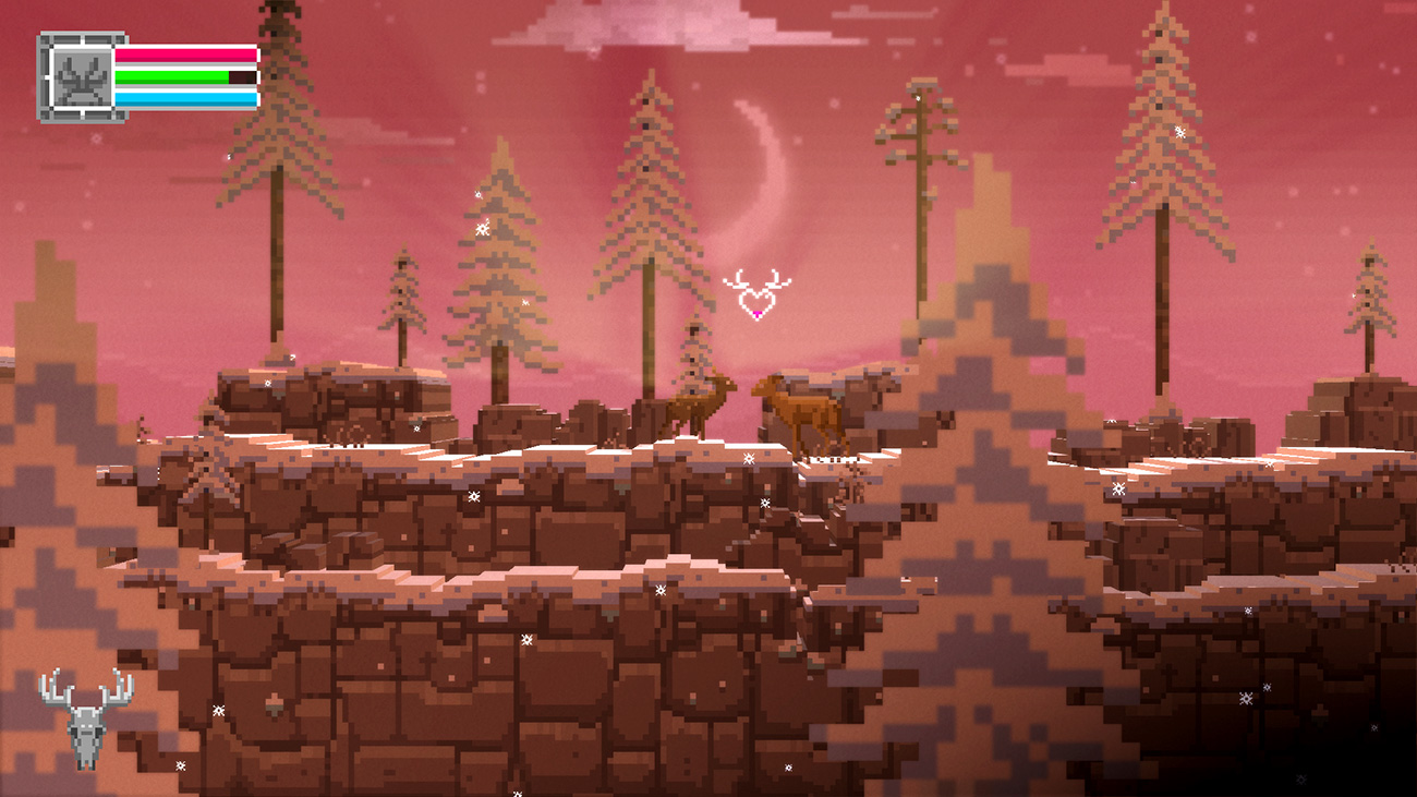 In this game you’re playing as a human hunter who has been transformed into a deer to learn some deep life-lesson. You start off as a small fawn, it’s a side-scrolling platformer and you just begin running to the right. Along the way you can encounter all types of forest animals, some are peaceful bearing a heart as their health bar, and others will attack you, like foxes, wild boars, snakes etc. These you can kill by charging into them, as a small fawn though you don’t deal much damage, but as you advance you grow up. Eventually you’ll become a fully grown buck, being able to jump higher and attack harder. Be aware though, hurting innocent animals might bring punishments… but there’s also achievements to be gained.. 😀